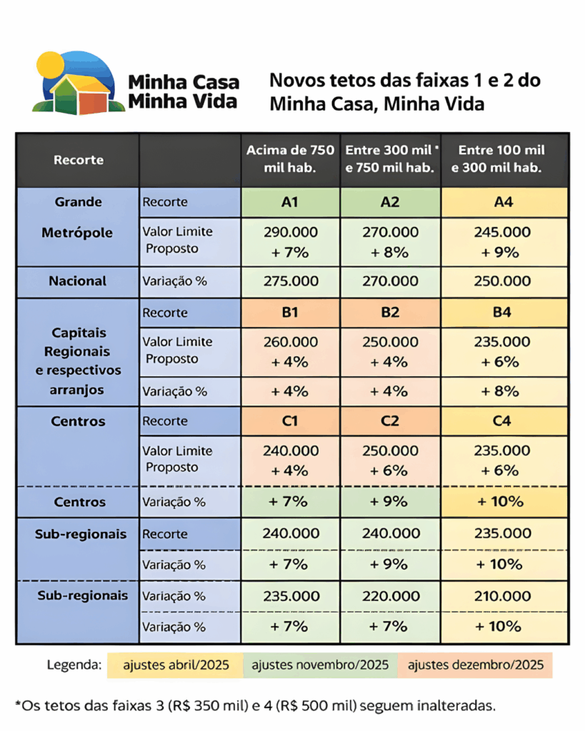 O programa Minha Casa, Minha Vida teve uma atualização importante aprovada pelo Conselho Curador do FGTS. A novidade é o aumento dos tetos de financiamento das faixas 1 e 2, permitindo que mais famílias tenham acesso ao crédito imobiliário.