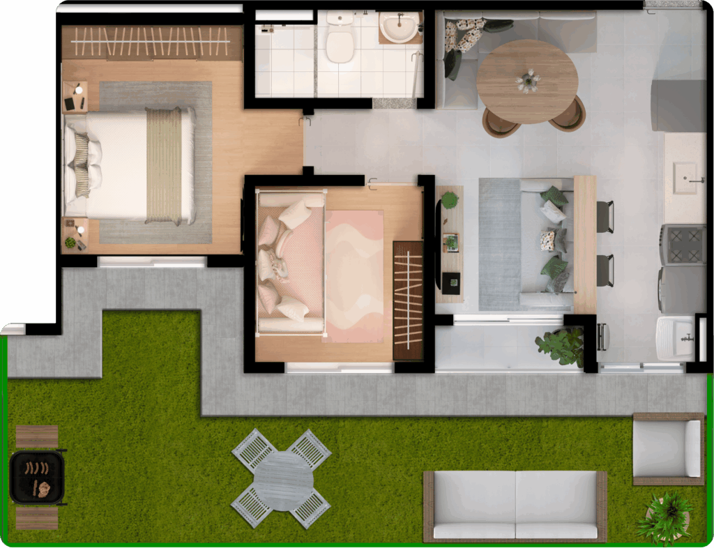 Um apartamento Garden é uma unidade localizada no térreo, que conta com uma área externa privativa.